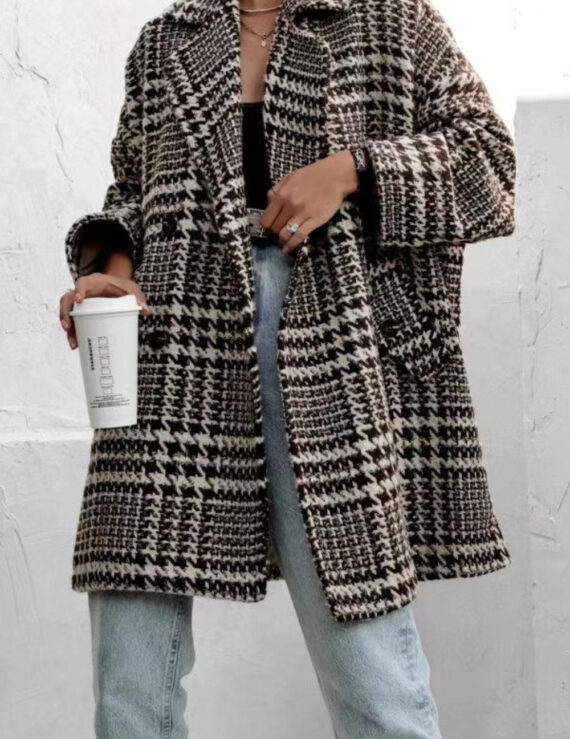 Houndstooth Collared Neck Long Sleeve Coat with Pockets